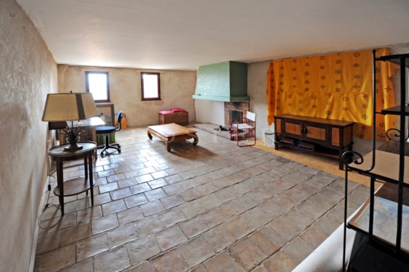 Au deuxième étage, un grand séjour avec cheminée et un mur en pierres apparentes et une cuisine.