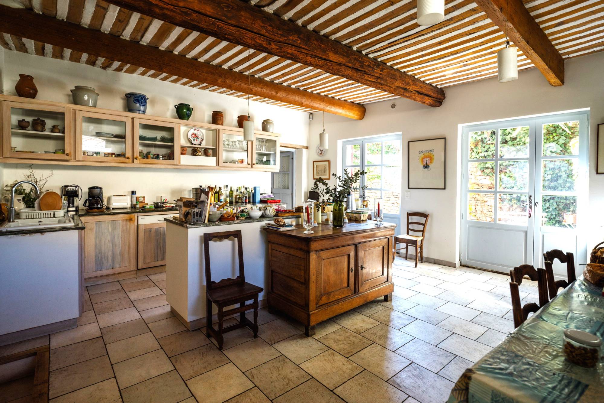 Dés l'entrée il est facile de ressentir que l'on se trouve dans une maison de maître, les murs en pierres de taille nous accueillent. Un salon cheminée conduit vers un autre salon voûté qui donne accès à une grande cuisine lumineuse avec sortie dans le jardin. Sur ce niveau rez-de-rue une chambre et une salle d'eau ont été aménagées.