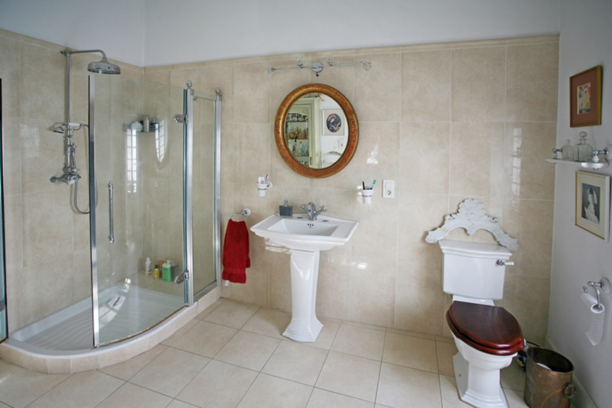 A l’étage supérieur, un seuil, un salon TV avec double porte vitrée qui le sépare de la chambre principale (cheminée en marbre), puis une salle de bains avec wc.