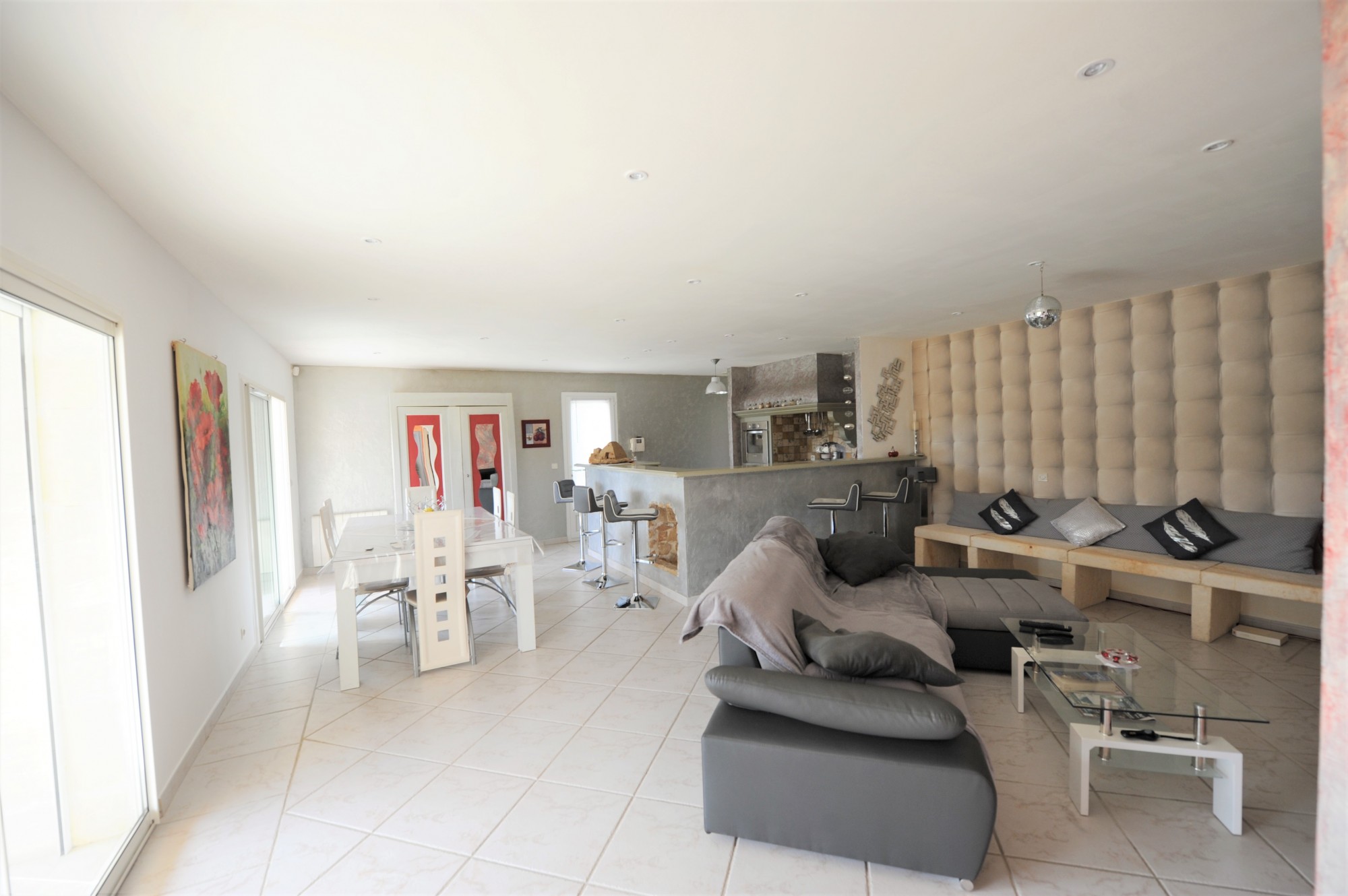Cette maison de plain-pied vous offre un grand hall d’entrée avec placard qui donne sur un bel espace de vie de plus de 50 m² regroupant la cuisine ouverte, le salon/salle à manger avec cheminée et insert donnant accès à une des terrasses couverte. Le tout baigné de lumière par ses baies vitrées s’ouvrant sur le jardin, exposé plein sud.